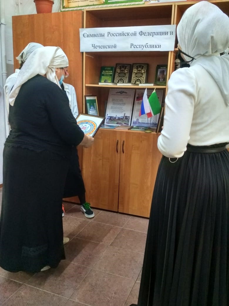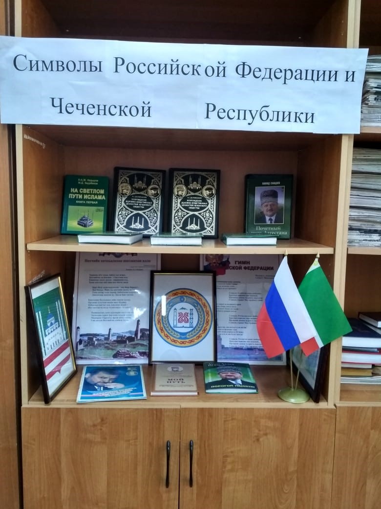 на уроках музыки учащиеся изучают текст и музыку Государственных Гимнов Российской Федерации и Чеченской республики. В школьной библиотеке была организована выставки по данной тематике. Классными руководители 1-11 классов проведены классные часы на темы: «Государственная символика России», Уроки России, тренинги « По законам добра» (изучение Конституции РФ, Конвенции по правам ребенка)
