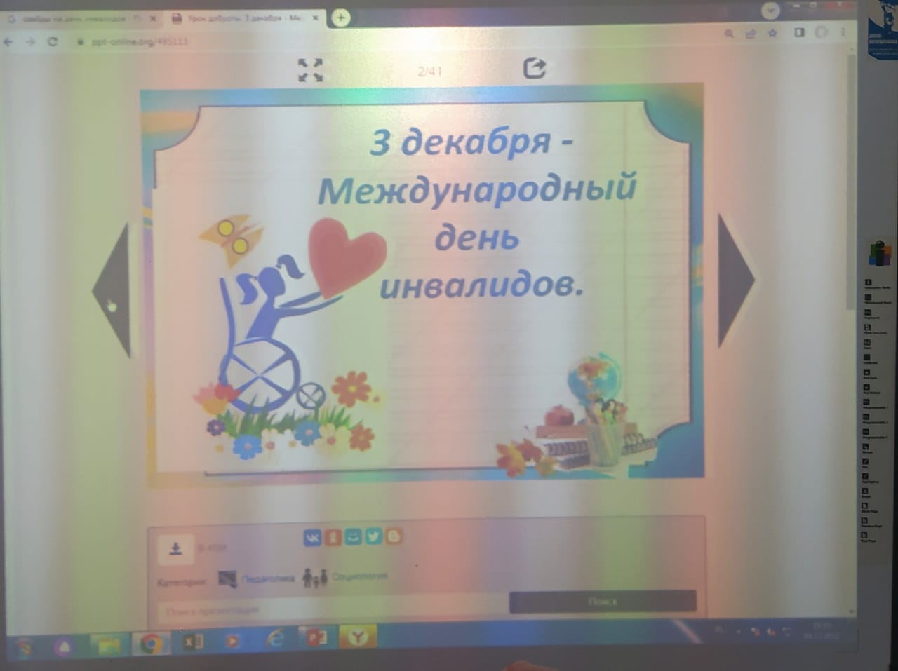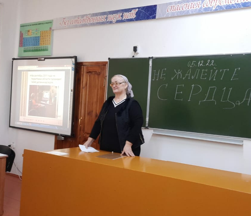05.12.20225 декабря в МБОУ "Лицей1 им.Н.А.Назарбаева" г. Грозного социальный педагог Насаева Л.И. и педагог-психолог Шавхалова М.И. провели мероприятия ко Дню инвалидов в 8-х классах.Цель:привлечь внимание обучающихся к проблемам людей -инвалидов,познакомить с некоторыми проблемами детей-инвалидов,способствовать развитию нравственных качеств обучающихся,развивать чувство сострадания и сопереживания к людям с ограниченными возможностями здоровья.