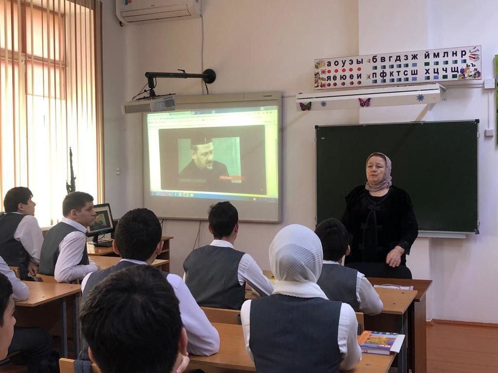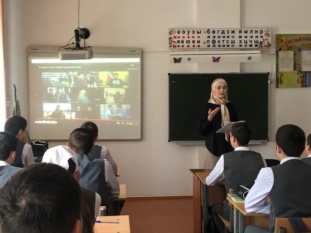 «Он был самой яркой фигурой чеченской политики и истинным вождем своего многострадального народа. Мудрость его живет в наших сердцах. Жизнь его промчалась ярким мгновением, но память о нем вечна» - эти слова прозвучали на классном часе у Барснукаевой П. М. На уроках в среднем и старшем звене классные руководители затронули исторические факты жизни и деятельности А-Х. Кадырова, его вклад в сохранение целостности государства и заслуги в деле восстановления мира и спокойствия на чеченской земле. На уроках были использованы фотоматериалы из периодической печати, выдержки статей.