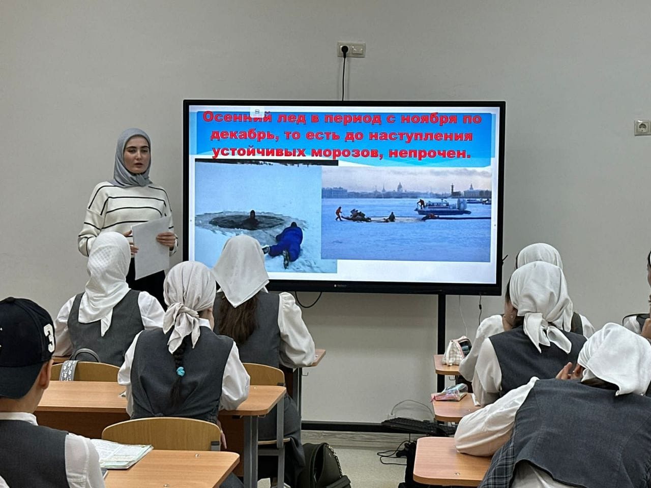 В рамках мероприятий по обеспечению и охране жизни людей на водных объектах г. Грозного в осенне-зимний период в МБОУ "Лицей 1 им. Н.А. Назарбаева" г. Грозного проведены разъяснительные беседы.