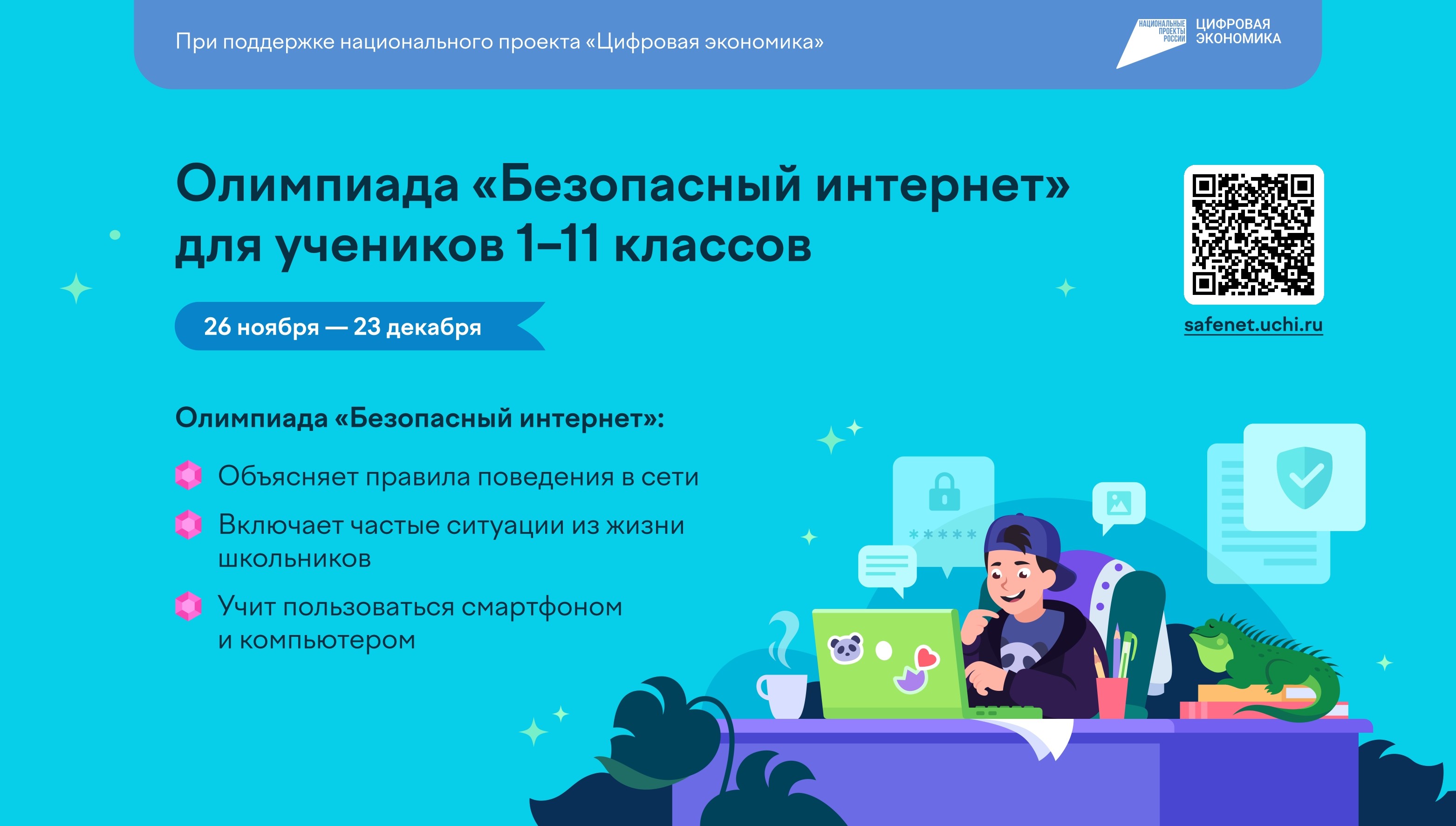 12.12.202426 ноября — 23 декабря в рамках нацпроекта «Цифровая экономика» наплатформе проходит всероссийская онлайн-олимпиада для учеников 1–11 классов «Безопасный интернет»: https://vk.cc/cFUcti Соревнование направлено на развитие навыков безопасного поведения винтернете. Интерактивные задания моделируют реальные ситуации, скоторыми школьник может столкнуться в сети, что помогает научитьсяориентироваться в виртуальной среде. Присоединяйтесь, будет интересно, а еще полезно: соревнование помогаетразвить этику общения и узнать, как обезопасить себя от мошенников прииспользовании смартфона и компьютера.Участие бесплатное, специальных знаний не требуется. По окончаниикаждому полагается награда: сертификат, грамота или диплом.