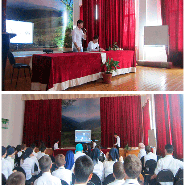 Представители молодёжной организации «Стрипт – воркоут» Юнус Кудузов, Умар Бакаев и Аслан Сулиманов, в актовом зале лицея, с учащимися 5-11-х классов провели беседу на тему «Здоровый образ жизни»
